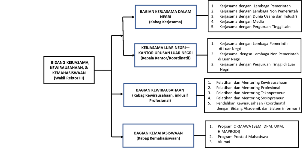 Area Kinerja Kunci (Key Results Area) bidang kerjasama, kewirausahaan, dan kemahasis -waan meliputi Kerjasama Dalam dan Luar Negeri, Program pengembangan Kapasistas Kewirausahaan yang meliputi pendidikan kewirausahaan, pelatihan kewirausahaan, dan pelatihan profesional, dan program pembinaan organisasi kemahasiswaan.  Area Kinerja Kunci tersebut dapat digambarkan dalam suatu kerangka kerja sebagai berikut.